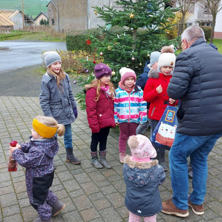 Die Kinder aus dem Dorf haben den Weihnachtsbaum mit Kugeln, teils auch Selbstgebasteltem geschmückt.